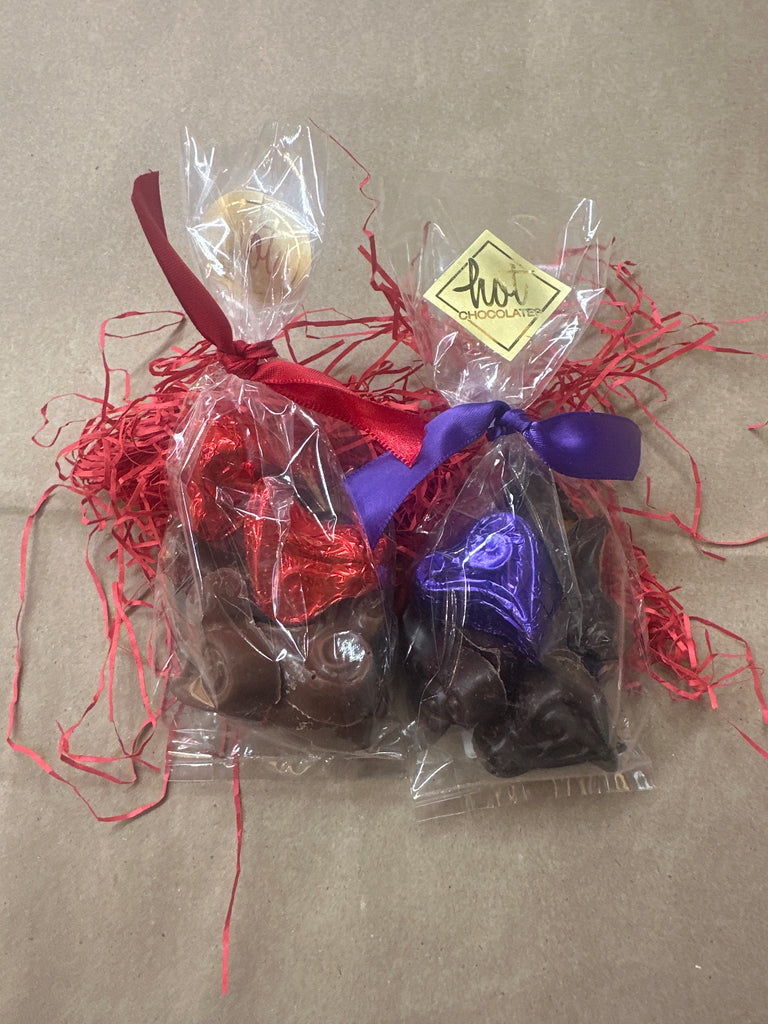 Solid Colombian chocolate. These fun hearts are bagged and bowed, with a few festively foiled.